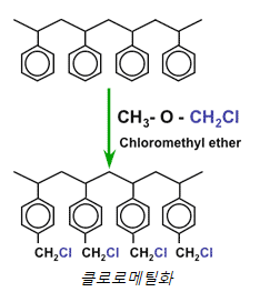 첫 번째 단계는 클로로메틸화 단계로, 폴리머 비드와 클로로메틸 메틸에테르 간의 반응이다.