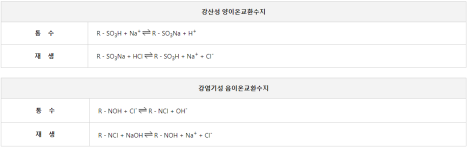 또한, 교환기의 종류에 따라 양이온 교환수지(Cation exchange resins)와 음이온 교환수지(Anion exchange resins)로 분류한다.