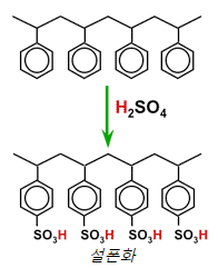 강산성 양이온 교환 기능성은 고온에서 농축 황산과 접촉하여 술폰화 반응을 통해 화학적으로 활성화를 시킬 수 있다.
