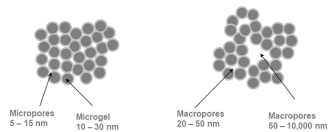 다공성 수지는 20~100nm (200~1000Å) 크기의 거대 기공을 갖는다.