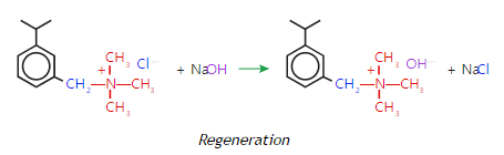 생성된 SBA 수지는 하이드록시기(OH-)형태보다 보관 및 운송되기 안정적인 염화물(Cl-) 형태이며, 탈염 시스템에서 사용하기 전에 아래 그림과 같이 가성소다로 재생해야 한다.