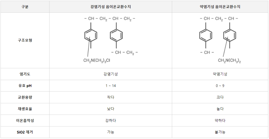 * (참조) 강염기성/약염기성 음이온교환수지 특징