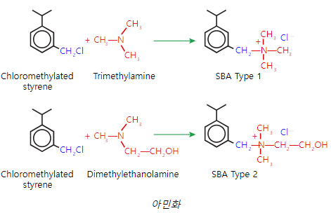 SBA Type 1은 가장 일반적인 강염기 교환기이며, SBA Type 2는 1형 대비 염기성이 다소 낮다.