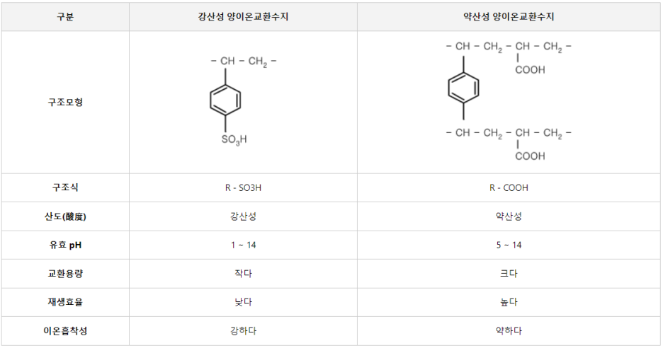 * (참조) 강산성/약산성 양이온교환수지 특징