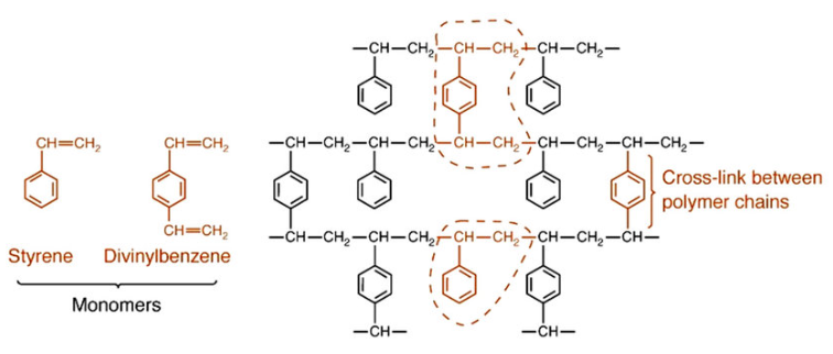 Vinyl기의 이중결합은 긴 사슬로써의 중합을 가능하게 하고, 이러한 선형(Linear) 폴리머 사슬을 안정적인 3차원 구조로 만들기 위해 가교제인 Divinyl Benzene(DVB)를 투입한다.