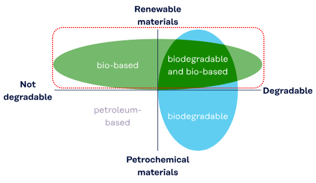 비생분해성 소재는 친환경 물질로부터 원료 또는 제품화 되었기에 생산공정까지 탄소저감이 가능하다는 이점이 있다. 생분해성 소재는 탄소저감과 동시에 생분해가 가능하다는 장점이 있지만, 유통기한이 상대적으로 짧다.