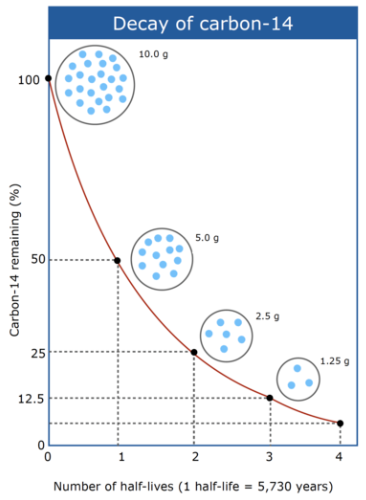 C-14의 생성 원리는 태양의 방사성 폭발로 생긴 중성자들이 공기에 있는 질소와 충돌하며, 질소가 탄소 14로 변하게 된다. 즉 대기 중에서 우주에서 날아오는 중성자에 의한 (n, p)반응으로 14N이 핵변환되어 생성된 C-14가 이산화탄소(CO2)의 형태로 존재하는 것이다.