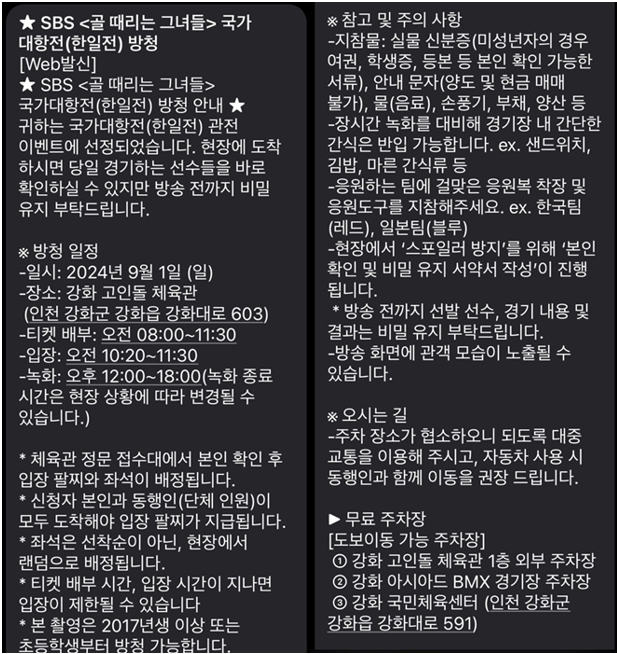골때녀 방청에 당첨되었고 방청일정은 9월 1일(일)인데 해당일에 참석이 가능한지 여쭤보셨습니다.