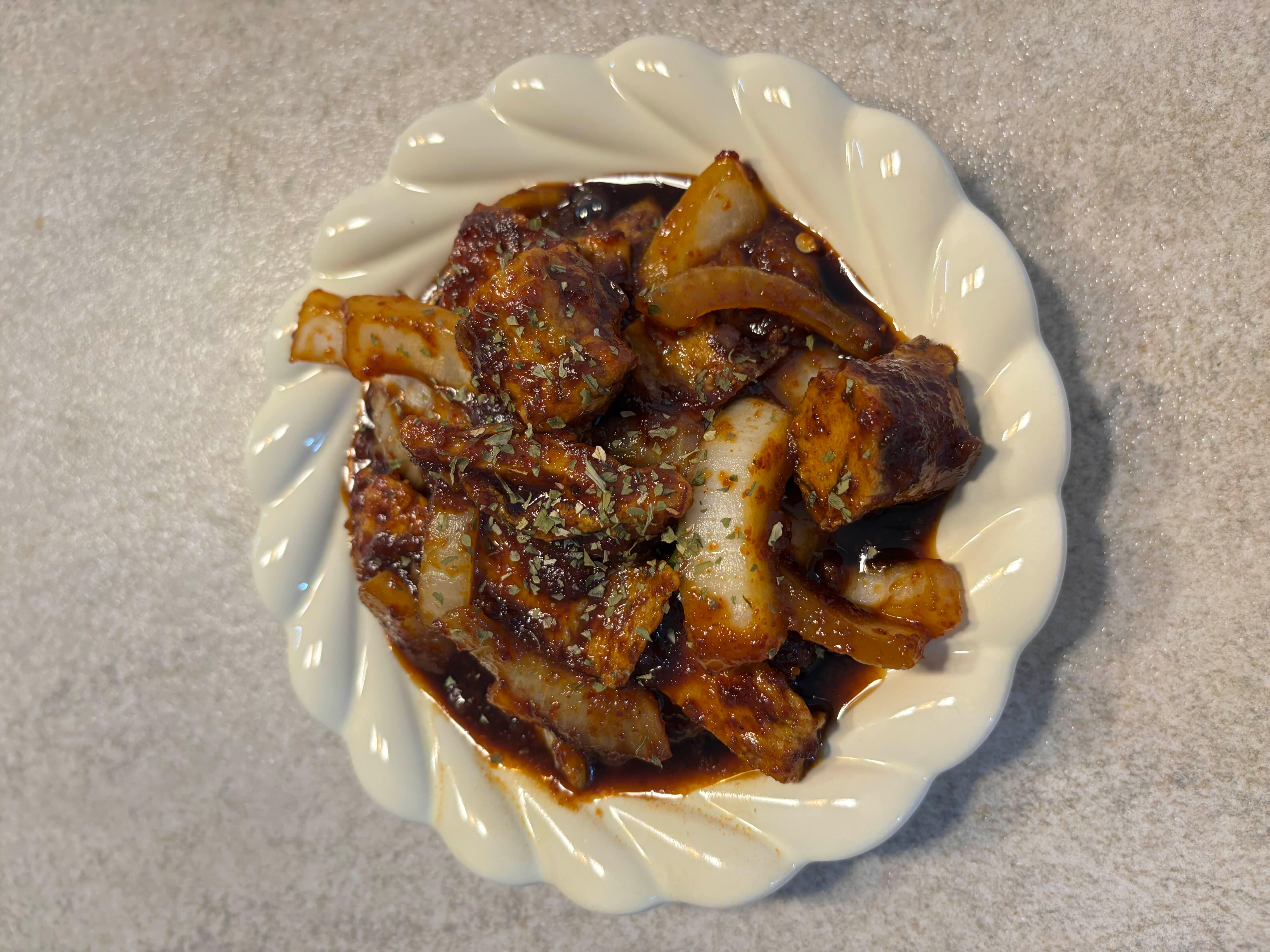 썰어놓은 어묵, 양파 투입하고 약불에 적당히 볶는다.
